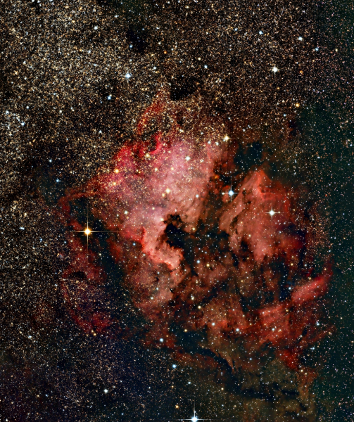 This week we see a widefield view of the North America nebula together with the Pelican nebula. This is a single frame image captured using the 200mm lenses and the M26C OSC CCDs. This represents around 8-hours of RGB broadband data and would be considerably improved with some 20-minute subs of narrowband data.