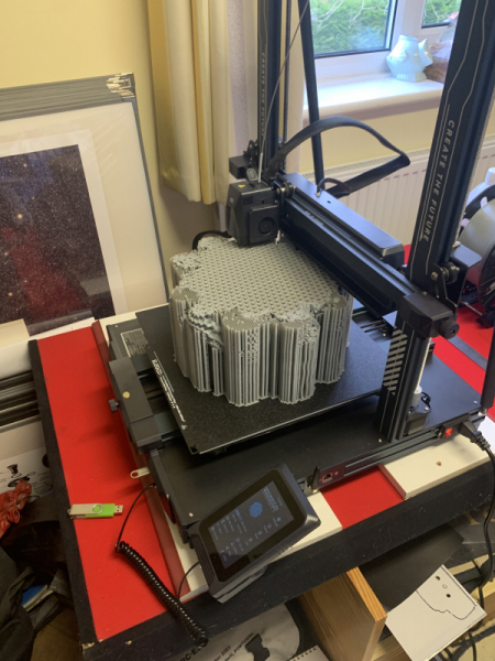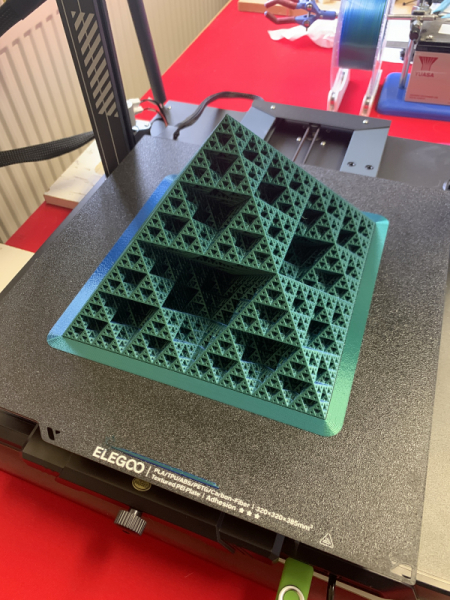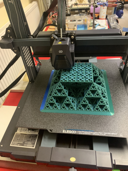 Not being one to hang about I went straight into printing a Sierpinski pyramid, 200mm on a side, and a 4-day print, as a test “ordeal by fire” of the new printer. I started printing on Friday afternoon and it is now Sunday afternoon, so 2 days of printing so far, with 2 more days to go. Why is the pyramid only 200mm on the base when the baseplate is 320mm across? Because I didn’t have enough filament on the reel to go for the full size print. You can see the progress so far in the image at top.